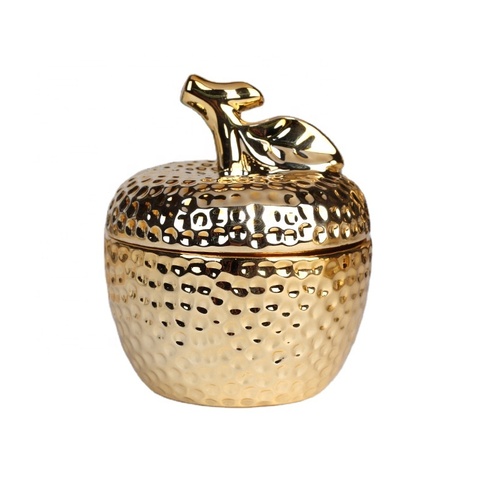 Lọ Nến Táo Bằng Gốm Sứ Vàng Có Nắp Hộp Nến Lê Có Lá Sắt